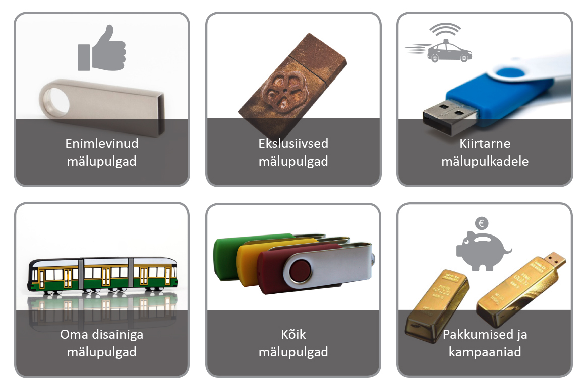 Meie kaudu leiate mälupulga messile, kingituseks, jagamiseks. Mälupulgad firma oma logoga, pilditrükiga, oma kujundi või disainiga. Mälupulgad oma Pantone värvikoodiga. Mälupulgad puu-, plastik-, metall-, klaas- või hoopis kivimaterjalist. Milline tahes on Teie soov või vajadus, me täidame selle!